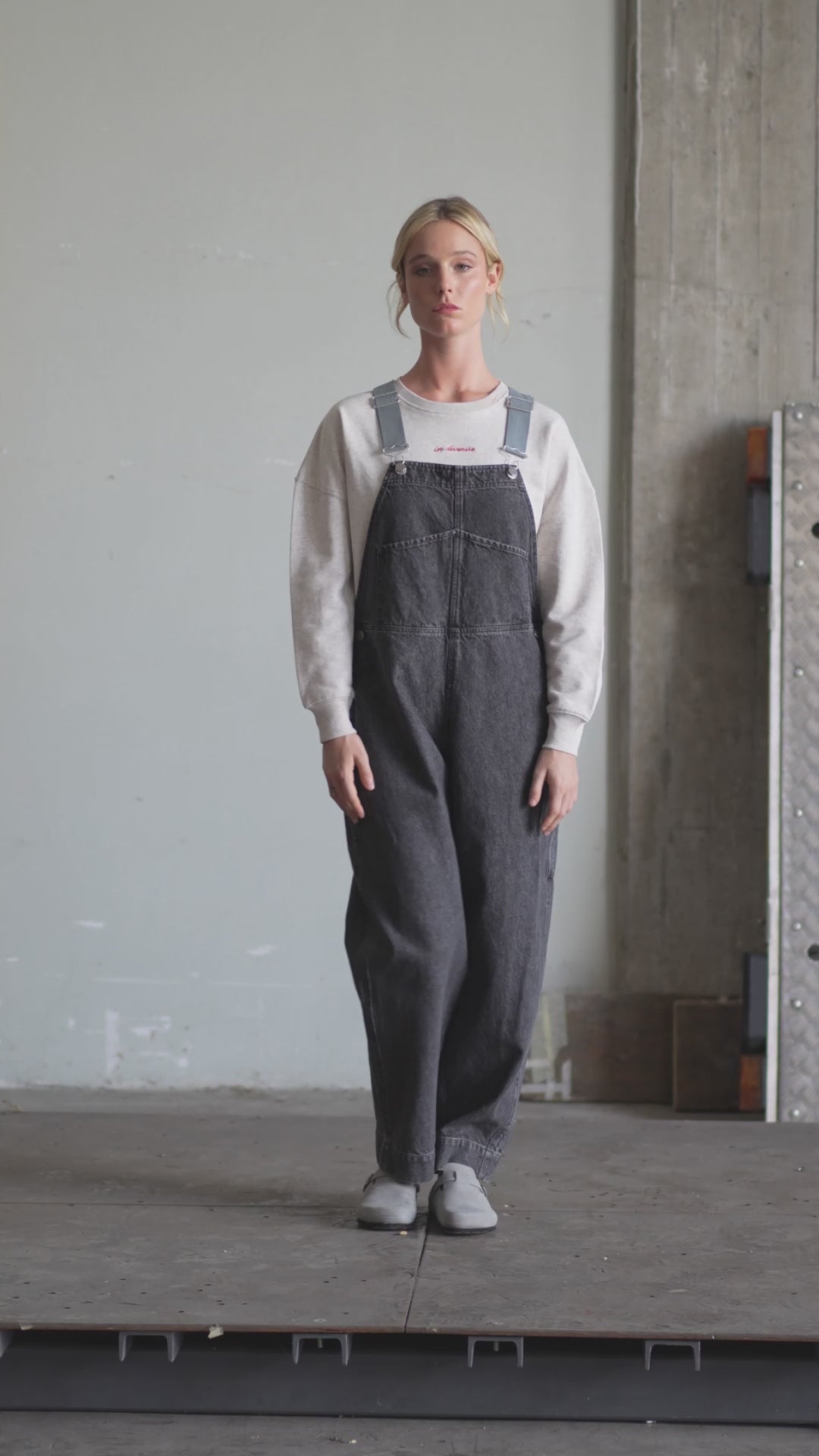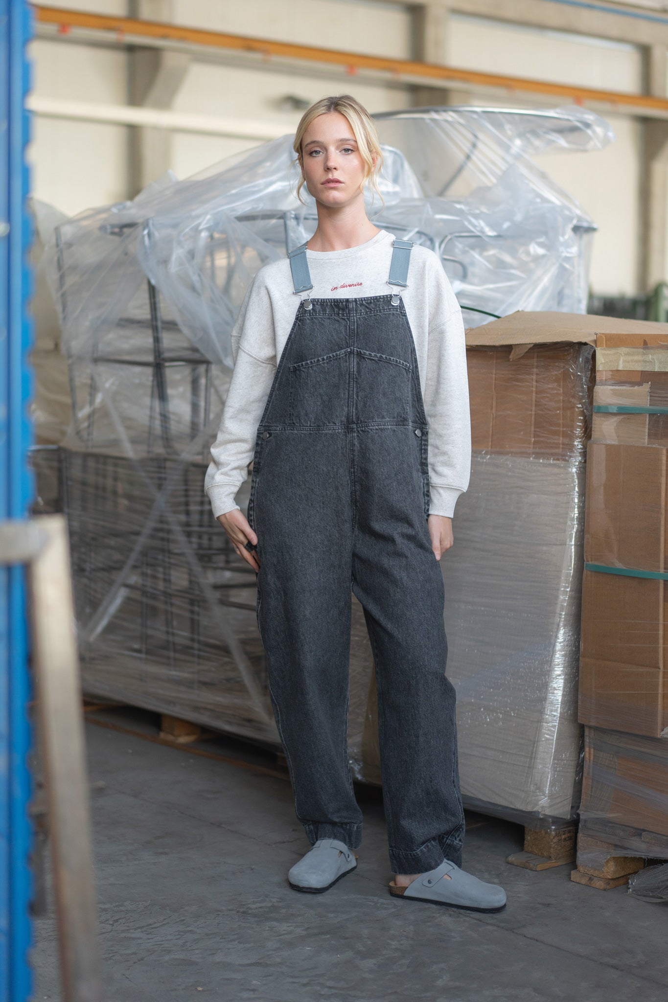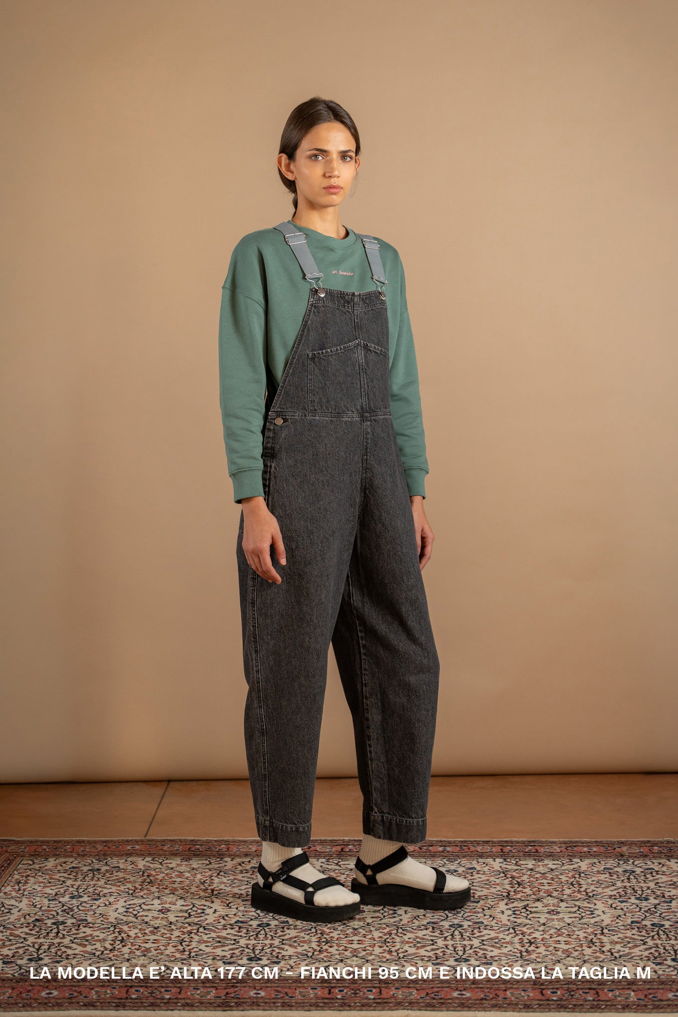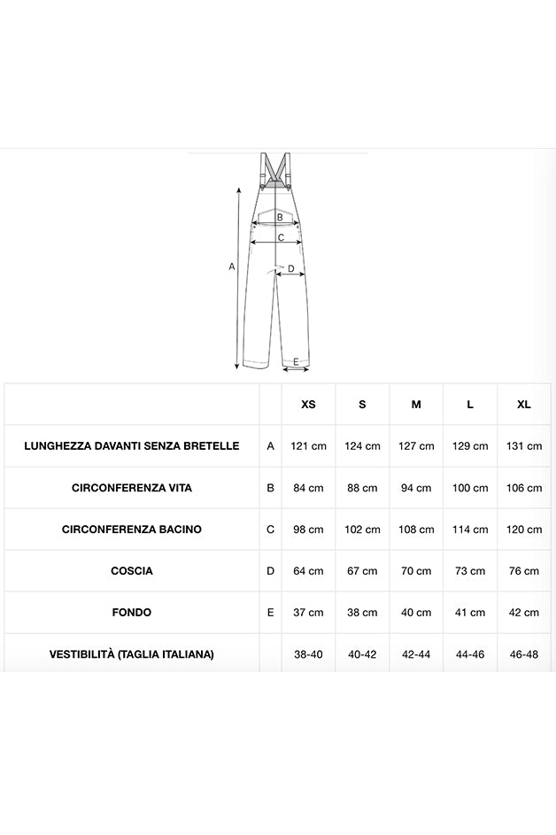 La salopette ha una vestibilità comoda in vita e fianchi. E' dotata di bretelle regolabili che consentono di adattare la lunghezza. Il pantalone è ampio sulla gamba, chiudendo leggermente verso il fondo.