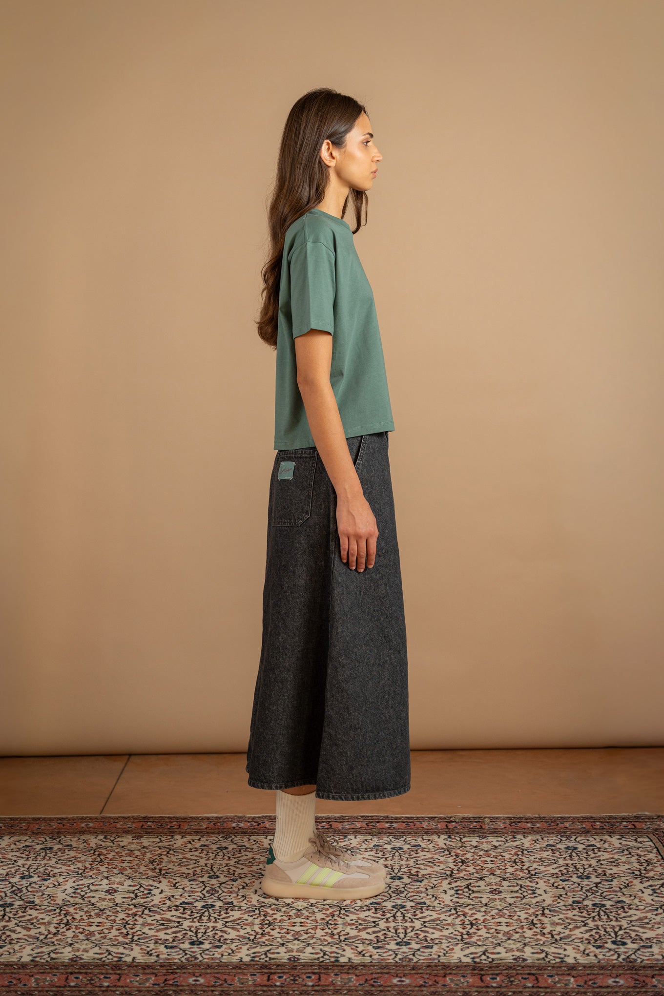 La t-shirt ha vestibilità boxy, con maniche a giro e spalla scesa.